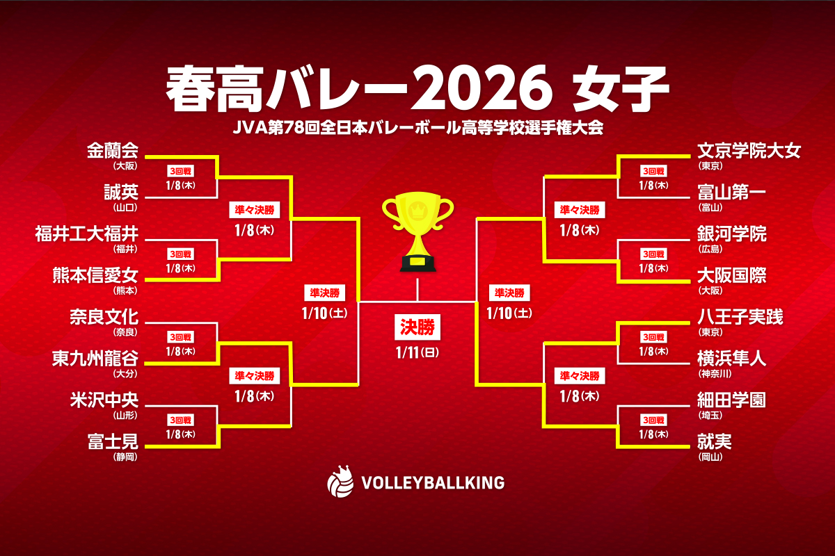 春高バレー 4分前 決勝は清風vs東山の関西対決に! 4連覇目指した駿台学園は準決勝敗退…【春高バレー男子】 春高バレー 6分前 清風がフルセットの激闘制し決勝進出! 駿台学園は4連覇の夢絶たれる…【春高バレー男子2026】 春高バレー 2時間前 多彩なコンビネーションと高い守備力で東山がストレート勝利! 【春高バレー男子2026】 アジア大会 3時間前 日本で行われるアジア競技大会の日程が決定!男女ともに2大会連続でのメダル獲得はなるか 春高バレー 4時間前 決勝は金蘭会vs就実に決定! インハイ女王と国スポ女王の対決に【春高バレー女子】 Vリーグ男子 4時間前 サンガイアに日体大の下田大夢、明治大の佐々木駿、平成国際大の荒井佑太が内定! SVリーグ男子 2026.01.09 世界2位と天皇杯準優勝チームの戦い「BS12 SVリーグ中継2025-26」1月11日(日)「大阪ブルテオン vs. ヴォレアス北海道」 春高バレー 2026.01.06 「一ノ瀬に負けたくない」鎮西の3年生エース岩下将大が春高で意地の爆発「悔しい思いもあった」 SVリーグ男子 2026.01.06 大阪ブルテオンに野添凌が入団! 「全力を尽くします」 春高バレー 2026.01.06 鎮西は勝利も2年生エースの一ノ瀬漣は涙「3年生に感謝したい」