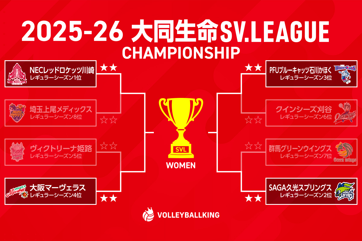 SVリーグ男子 7時間前 【SV男子結果】STINGS愛知が2連勝でRS3位を確定 サントリーの優勝はお預けに【第21節】 SVリーグ女子 7時間前 SILENT SIREN、NECレッドロケッツ川崎の“聖地”で応援歌「KETTO」のMV撮影!「選手と一緒に闘っている気持ちで」 Vリーグ男子 9時間前 クボタがVリーグ王者に! 第1セットは36-34の壮絶スコア【Vリーグ男子ファイナル】 SVリーグ女子 9時間前 SV女子のCS準決勝の対戦カードが決定! 昨季決勝のNEC川崎vs大阪MVも SVリーグ男子 2026.04.10 日鉄堺BZのマシュー・アンダーソンら主力外国籍選手3人が退団へ 髙野直哉ら2選手は引退 Vリーグ女子 2026.04.11 フォレストの向井沙樹ら3選手が引退 Vリーグ女子 2026.04.11 ブレス浜松の濱田義弘監督が退任 昨季はVリーグ女子で準優勝 SVリーグ男子 2026.04.11 3月にデビューのWD名古屋・前田凌吾が手指を手術 以前から負傷 SVリーグ女子 2026.04.11 NEC川崎が準決勝進出一番乗り! 準決勝では大阪MVか姫路と対戦 セリエA男子 2026.04.10 ペルージャがピアチェンツァに連勝! アウェイの地で決勝進出へ王手【セリエA男子】