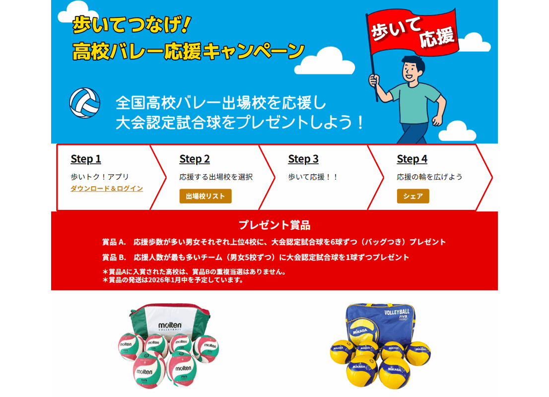 本企画では、アプリユーザーの日々の歩数が応援する高校への「応援歩数」としてカウントされ、男女それぞれの上位の高校チームに大会公式認定試合球がプレゼントされるというもの。実施期間(応援歩数集計期間)は、2025年12月8日(月) ~ 2026年1月8日(木)までとしている。