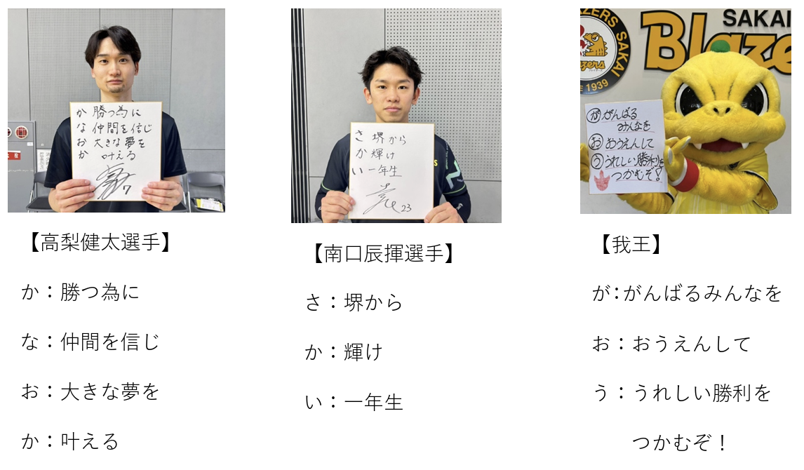 いよいよ迎えるレギュラーシーズン最終盤に向け、ここまで チーム最多のPOM 賞を獲得している高梨健太、日鉄堺BZ1 年生の南口、日鉄堺BZのマスコットである我王があいうえお作文で意気込みもコメントしている。